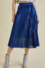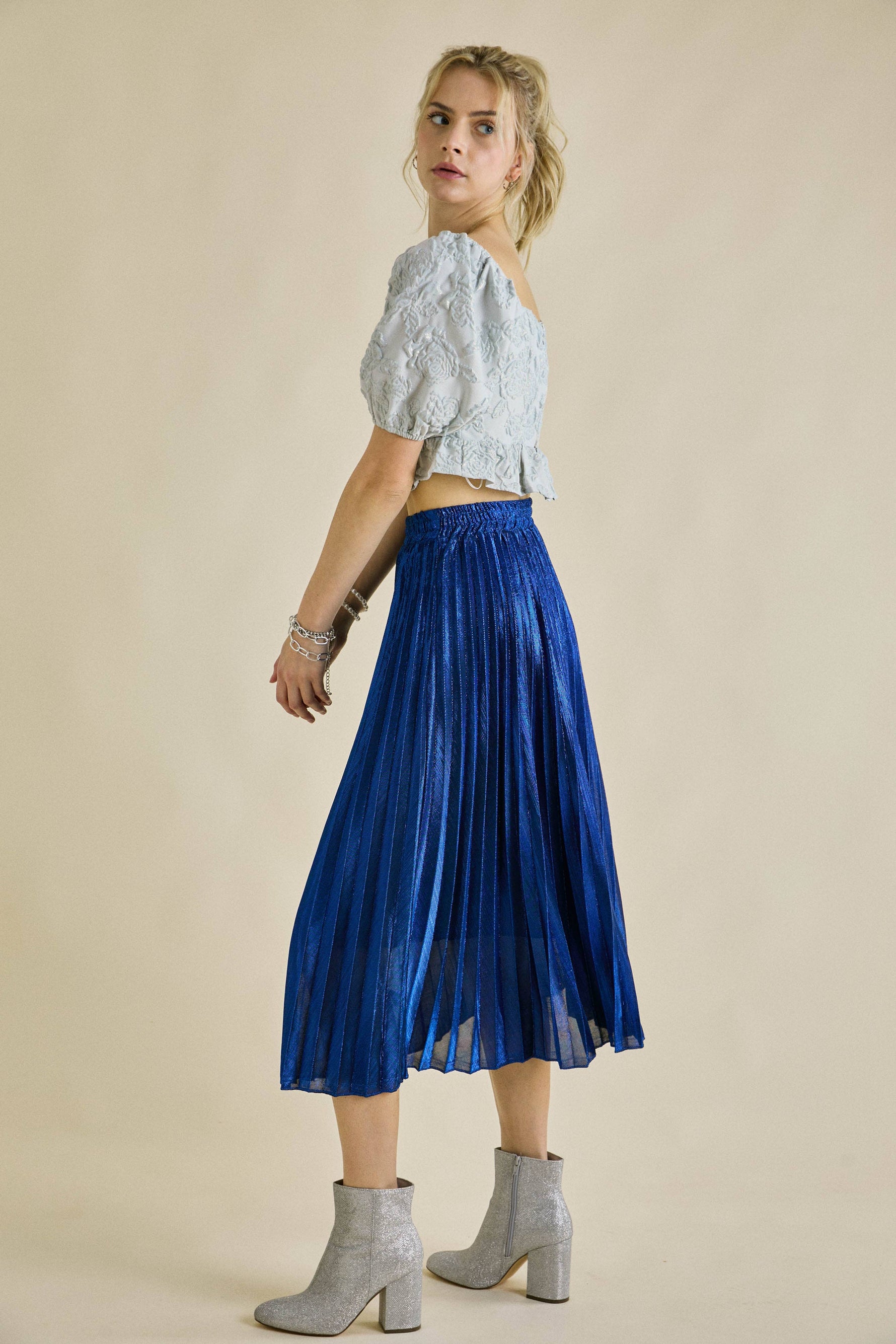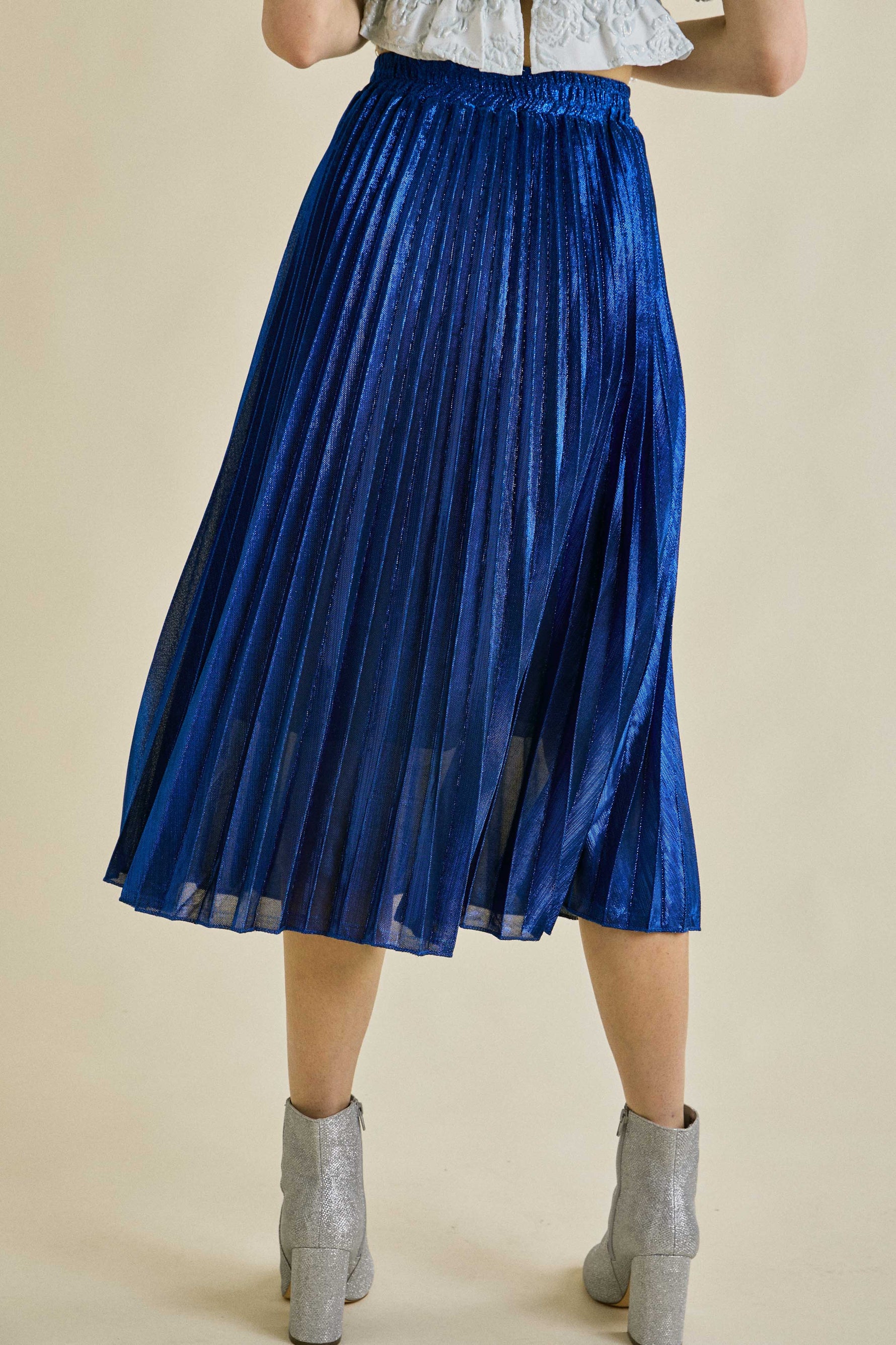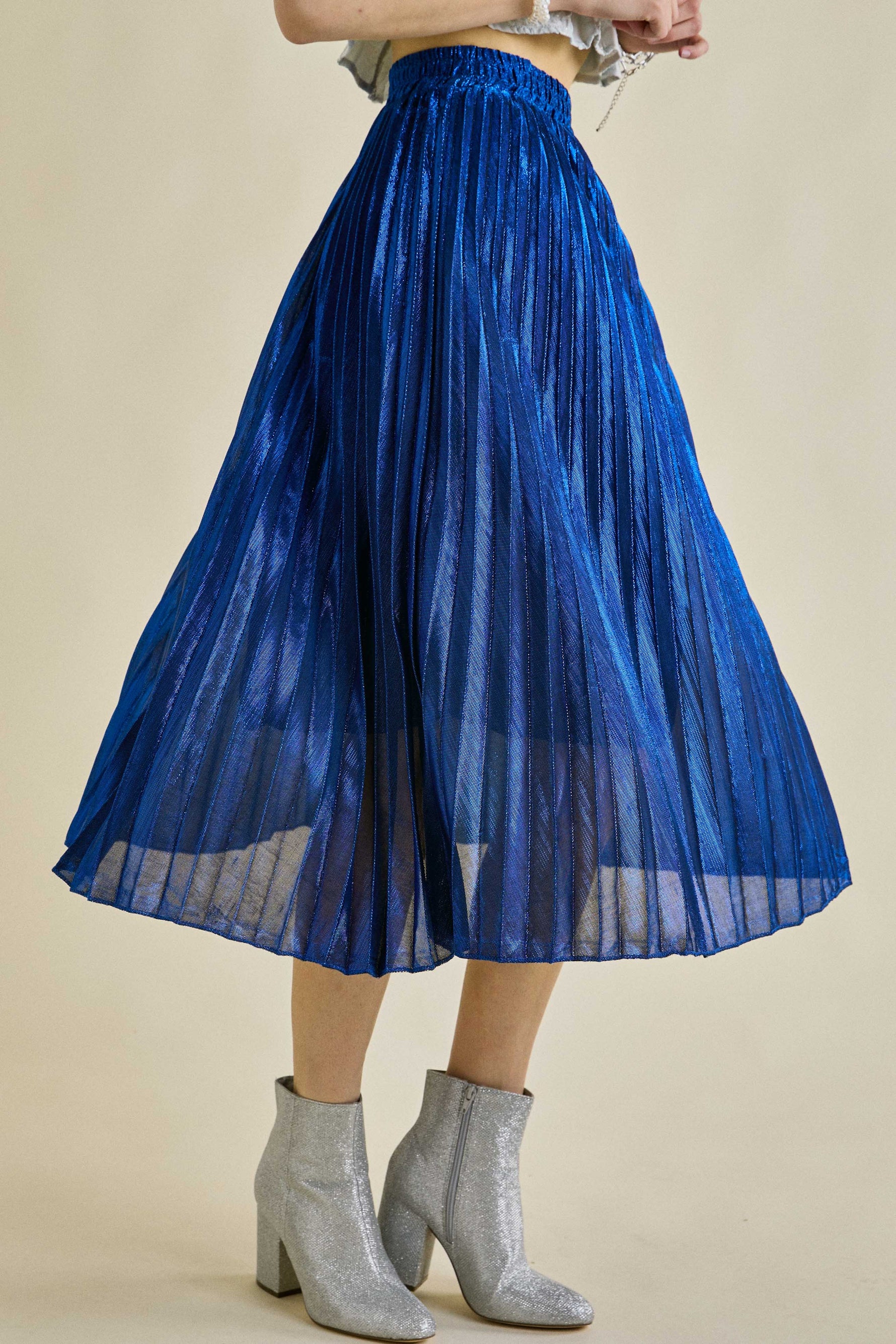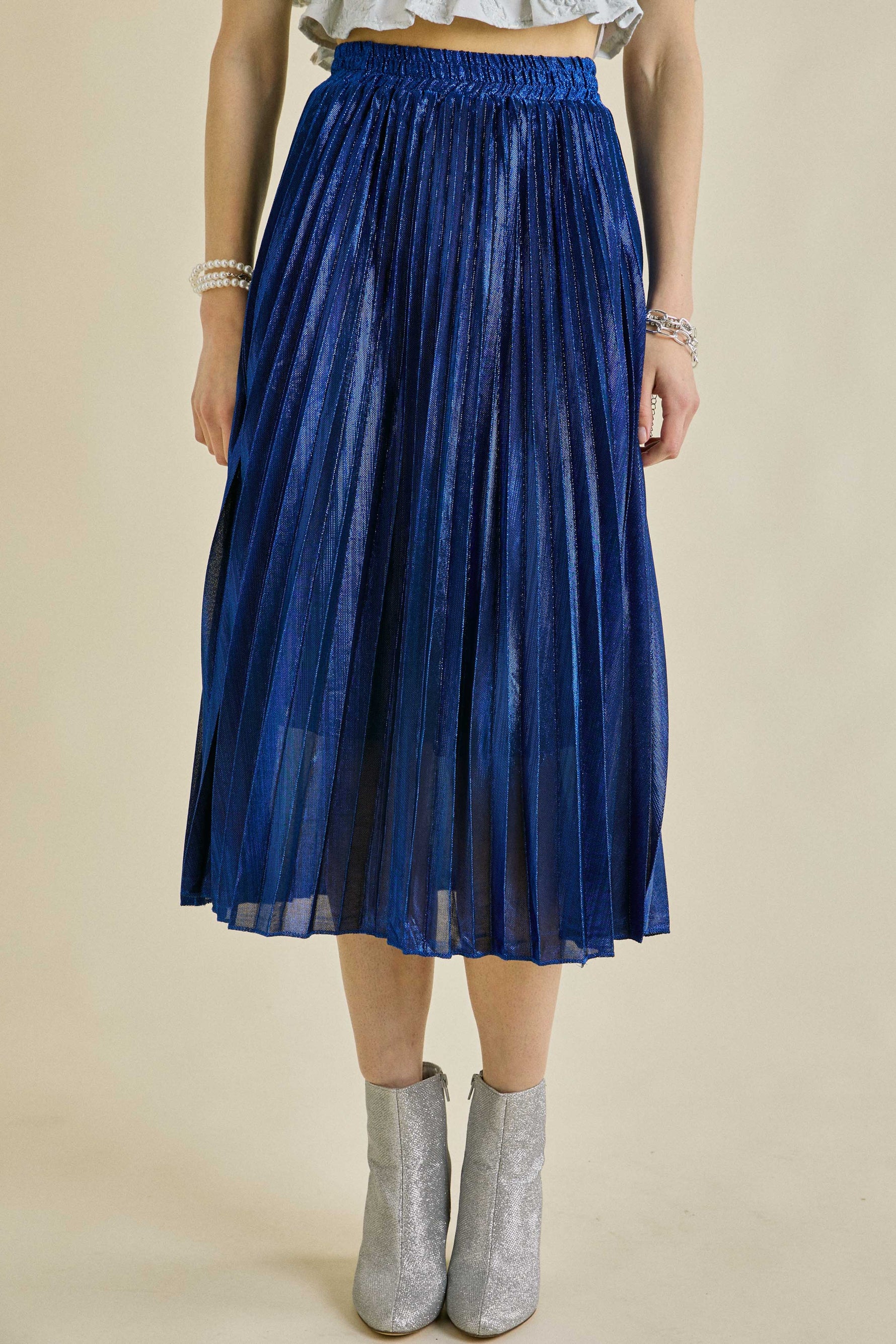 Our pleated maxi skirt is the perfect addition to your summer wardrobe. Glam up your work style or everyday look with our two glittery fun colors.