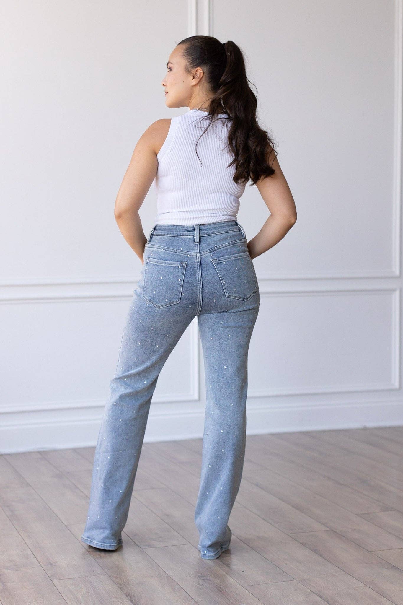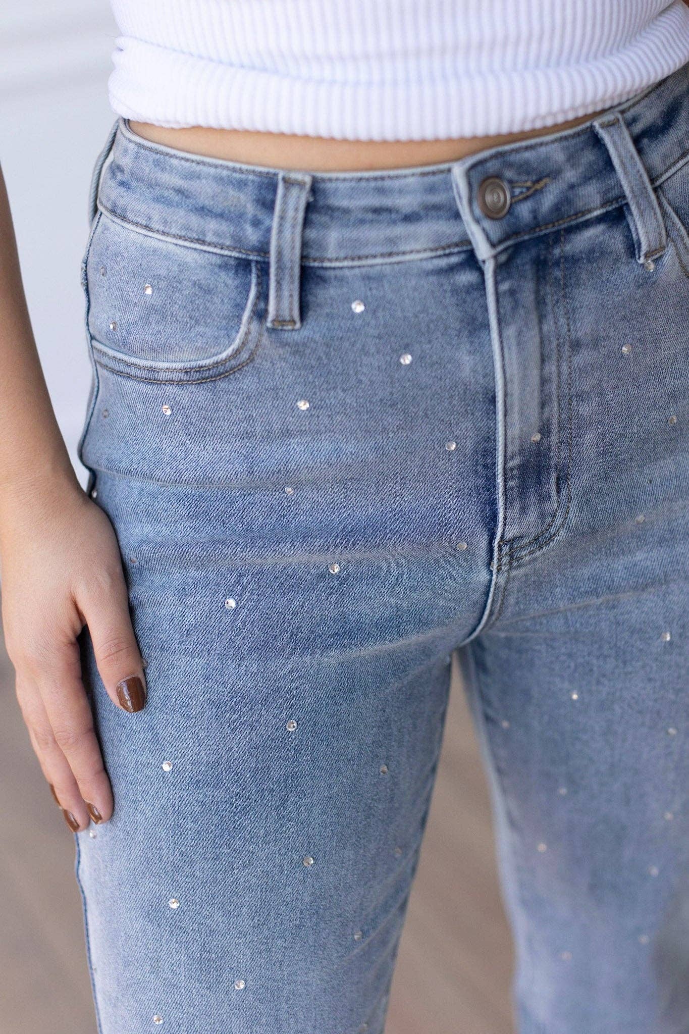 Step into the spotlight with our Light Wash Crystal Studded Straight Leg Jeans, a dazzling blend of casual comfort and glamorous detail. The light wash denim provides a versatile backdrop for the intricate crystal stud embellishments, adding a touch of sparkle and flair. These straight-leg jeans effortlessly combine everyday ease with elevated style, making them a standout choice for both daytime chic and evening allure. Embrace the brilliance of crystal studs and make a statement wherever you go with these uniquely embellished light wash jeans.