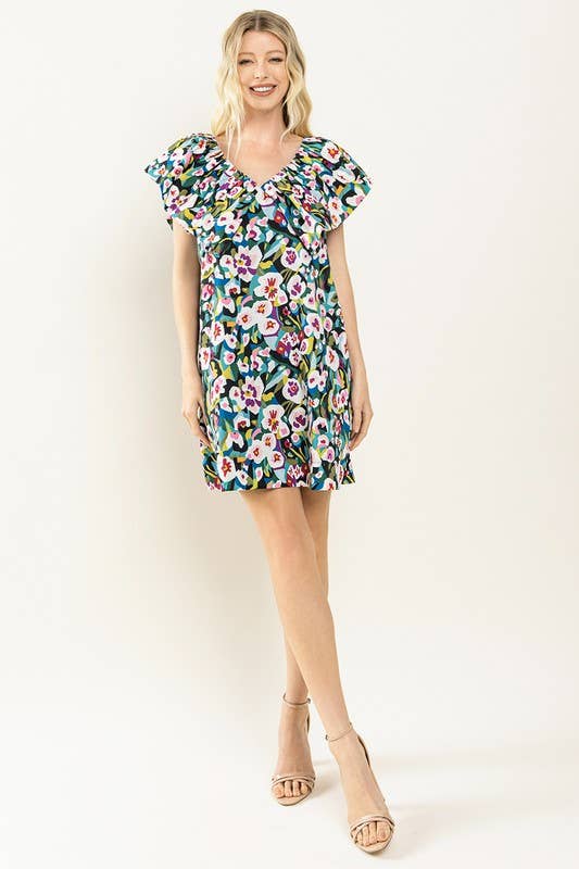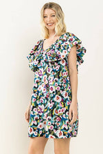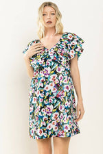 Flower printed, V-Neckline ruffle sleeve shift dress.