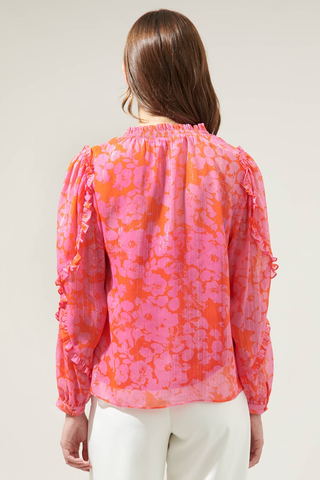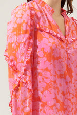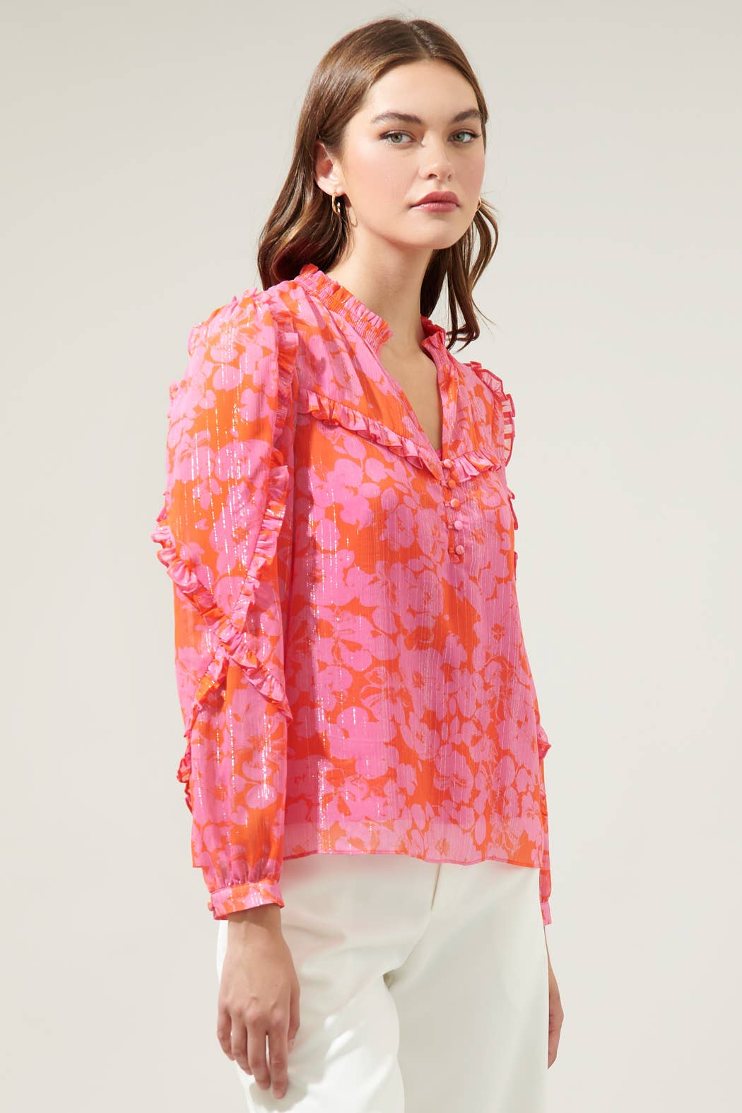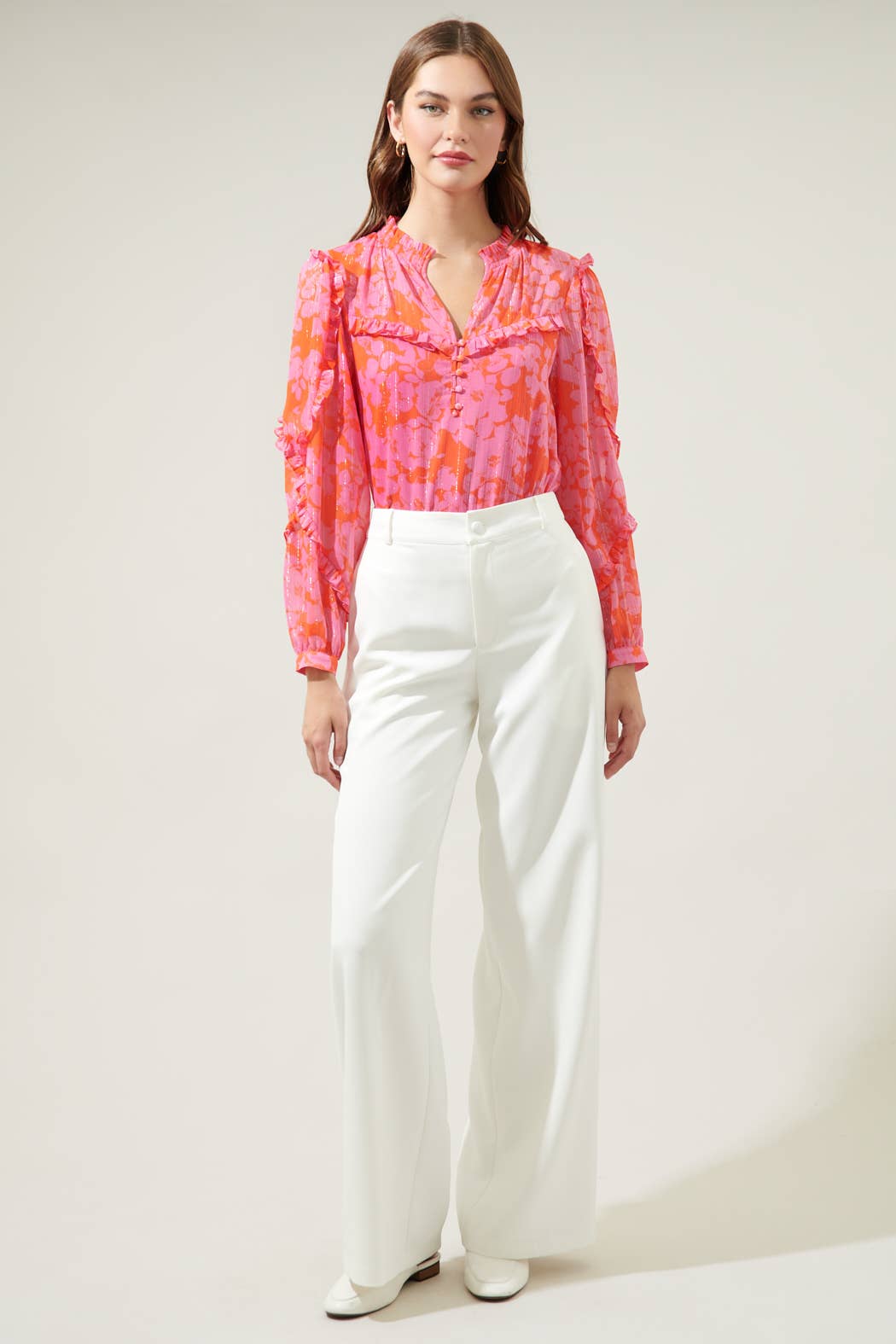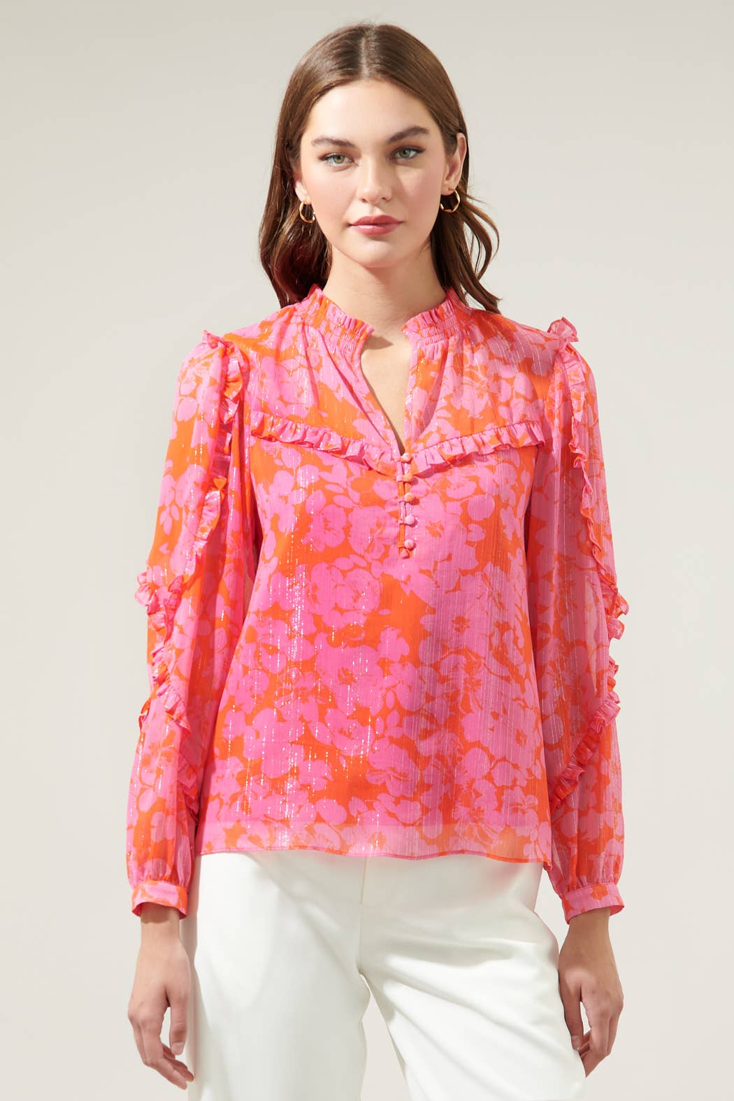 Bloom into beauty with the Ventura Split Neck Button Blouse! This beautiful pink top has an allover floral print, throughout with ruffle designs around the long sleeves, neckline connecting to the button up detail. This top has a relaxed fit ready to pair it up with any high waisted jeans or shorts. - Split neckline - Relaxed fit - Ruffle details - Lined - Color: Red pink Size + Fit - Model is 5'8" and wearing size XS - Measurements taken from size S - Chest: 19 3/4" - Length: 25"
