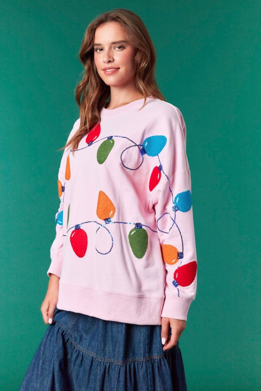 Multicolor Christmas Lights Sweatshirt -Multicolor sequin Christmas lights embroidery -Round neckline -Long sleeves -Raw seam -Side slits 60%Cotton 40%Polyester Made in China