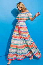 A printed woven maxi dress featuring off shoulder neckline with flounce, elasticized waist with self sash tie and tiered skirt
