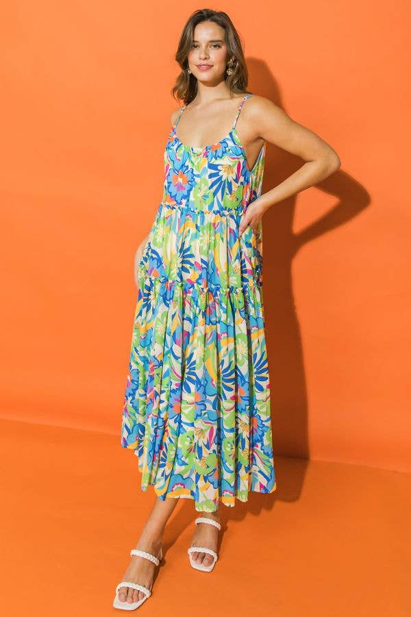 A printed woven midi dress featuring wide U neckline, adjustable spaghetti straps and tiered body with ruffled edge