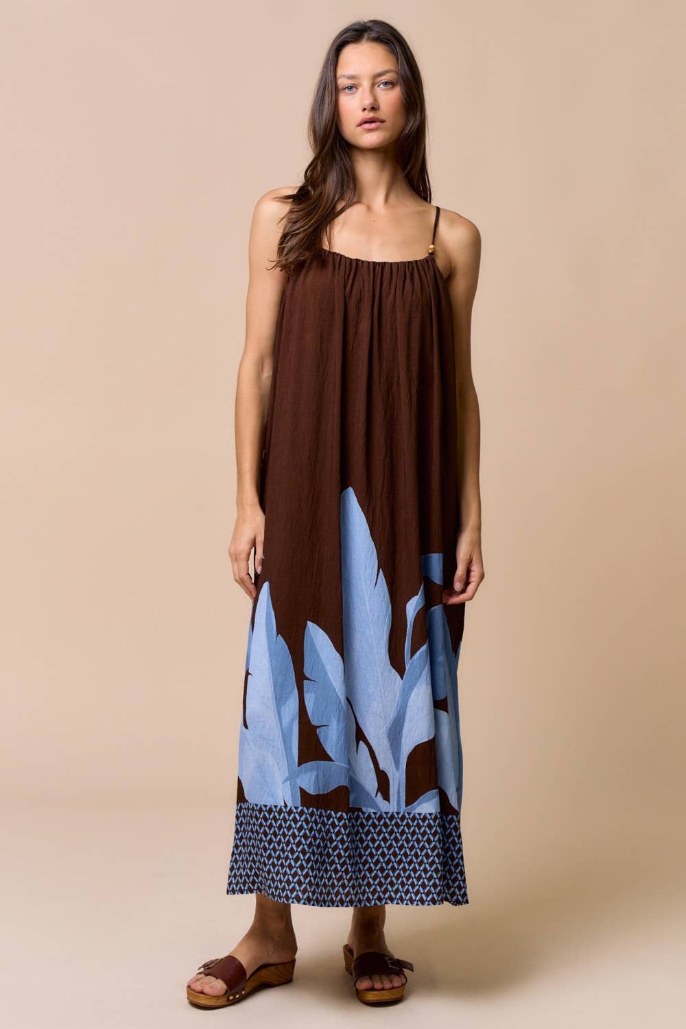 Breezy and elegant, this maxi dress features delicate straps and a flowing silhouette adorned with a tropical leaf print. Perfect for warm days, vacations, or effortless chic evenings.