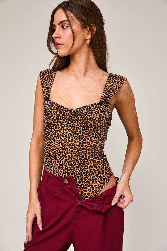 Unit price perRoar with style in this fierce Leopard Bodysuit! This bold bodysuit features a striking leopard print design with playful bow details on the shoulders. The sweetheart neckline adds a touch of sweetness to this wild and unique piece. Get ready to take a walk on the wild side with this one-of-a-kind bodysuit!