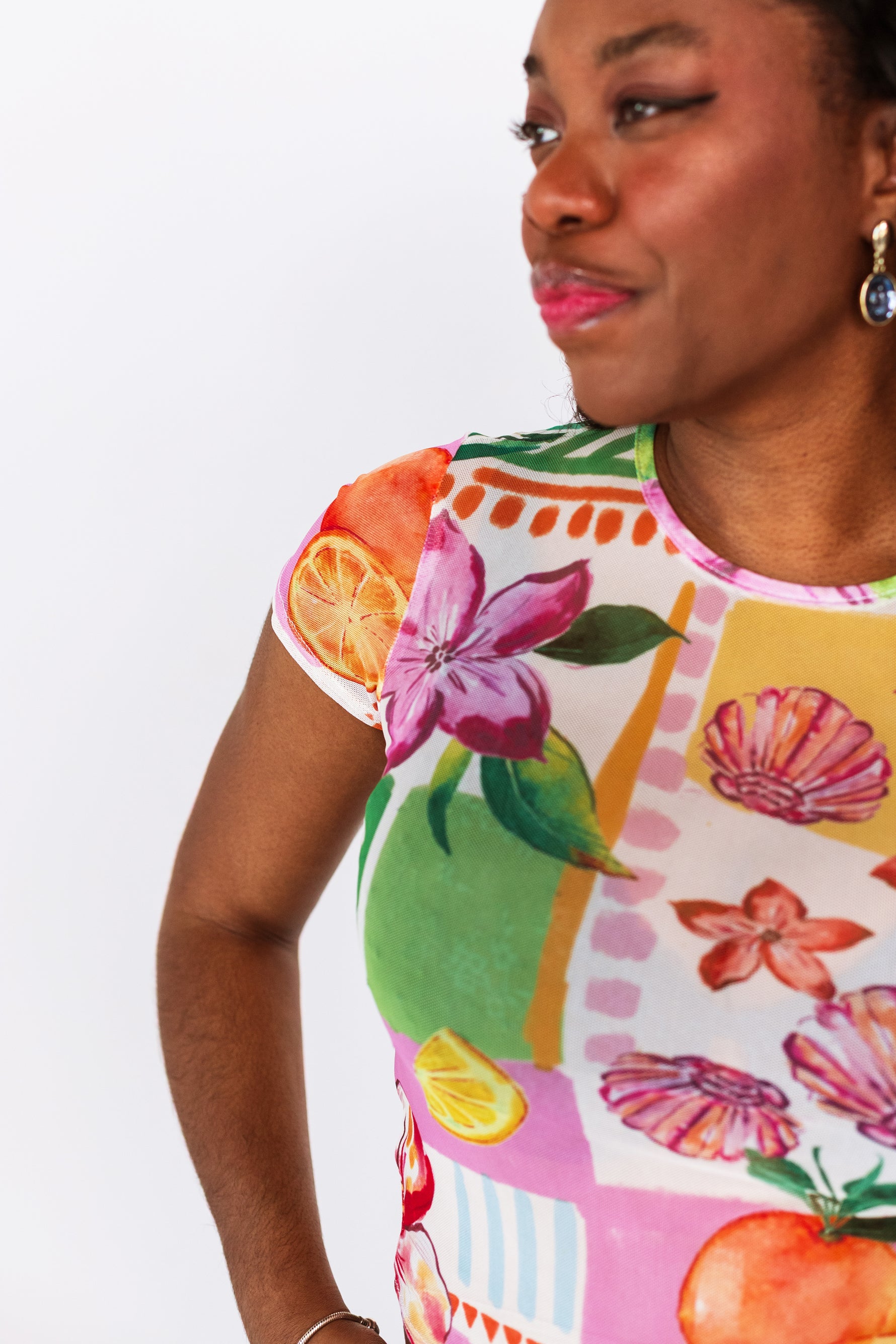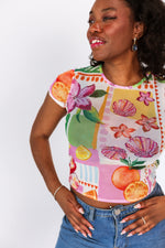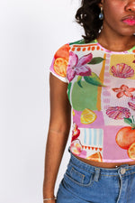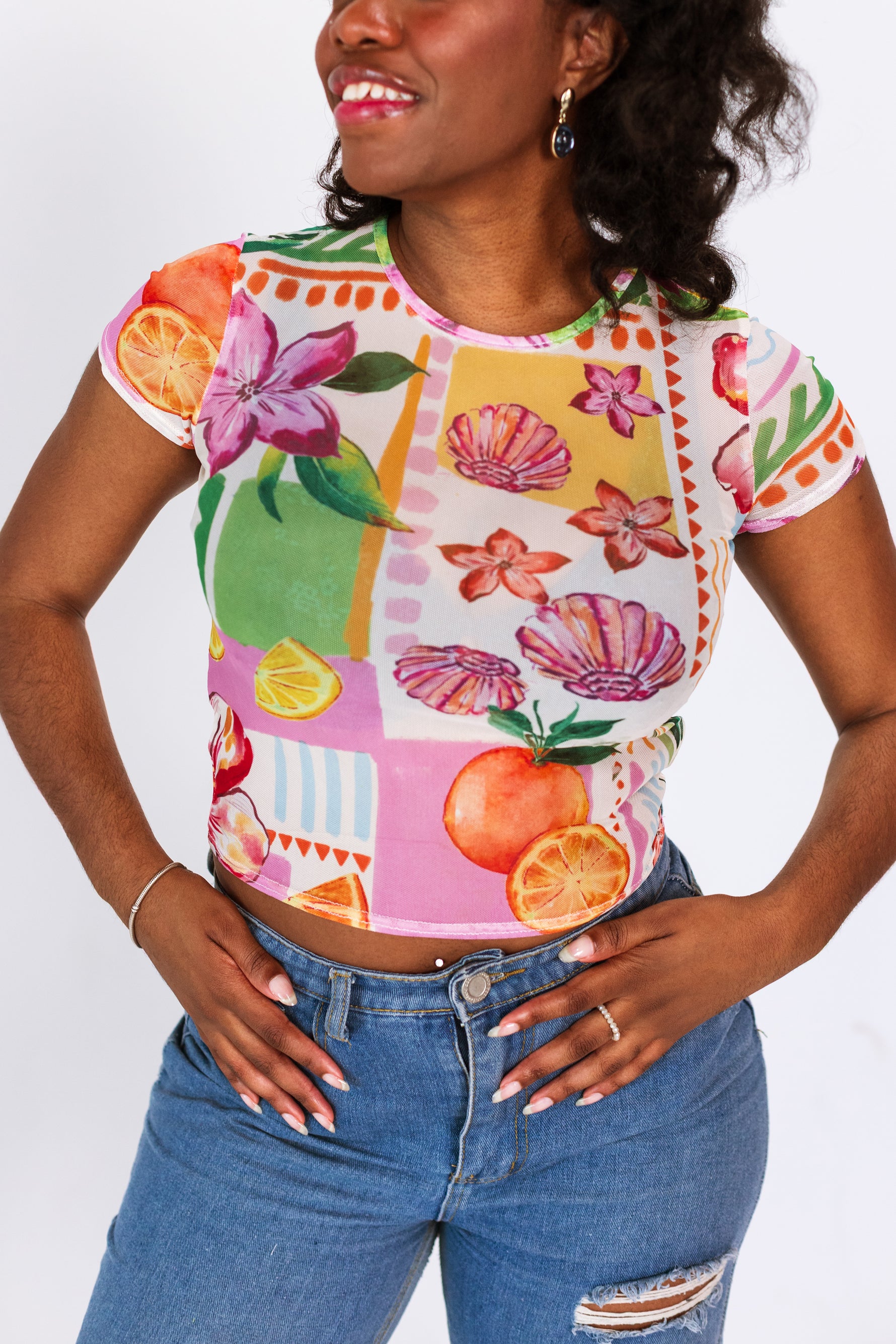 Unit price perThis playful baby tee features a tropical print mesh fabric with a slightly cropped cut. Its semi-sheer design adds a flirty touch, perfect for layering or wearing on its own.