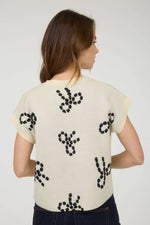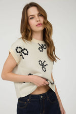 Unit price perAdorable bow-adorned knit sweater featuring a relaxed drop-shoulder silhouette and short sleeves for effortless style. The charming jacquard bow pattern adds a whimsical touch, while seamless construction ensures comfort all day long. Perfect for layering or wearing solo, this round-neck pullover brings a sweet, playful vibe to any casual outfit.