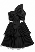 Unit price perStudio Strut and Bolt Collection. Knot twisted mini dress in satin fabric. This mini dress features an unique twisted and pleated bow at front, bodice with one shoulder construction with adjustable strap, smocking at back, pleated tiered mini A line ruffle skirt, side pockets, and cut out at front.