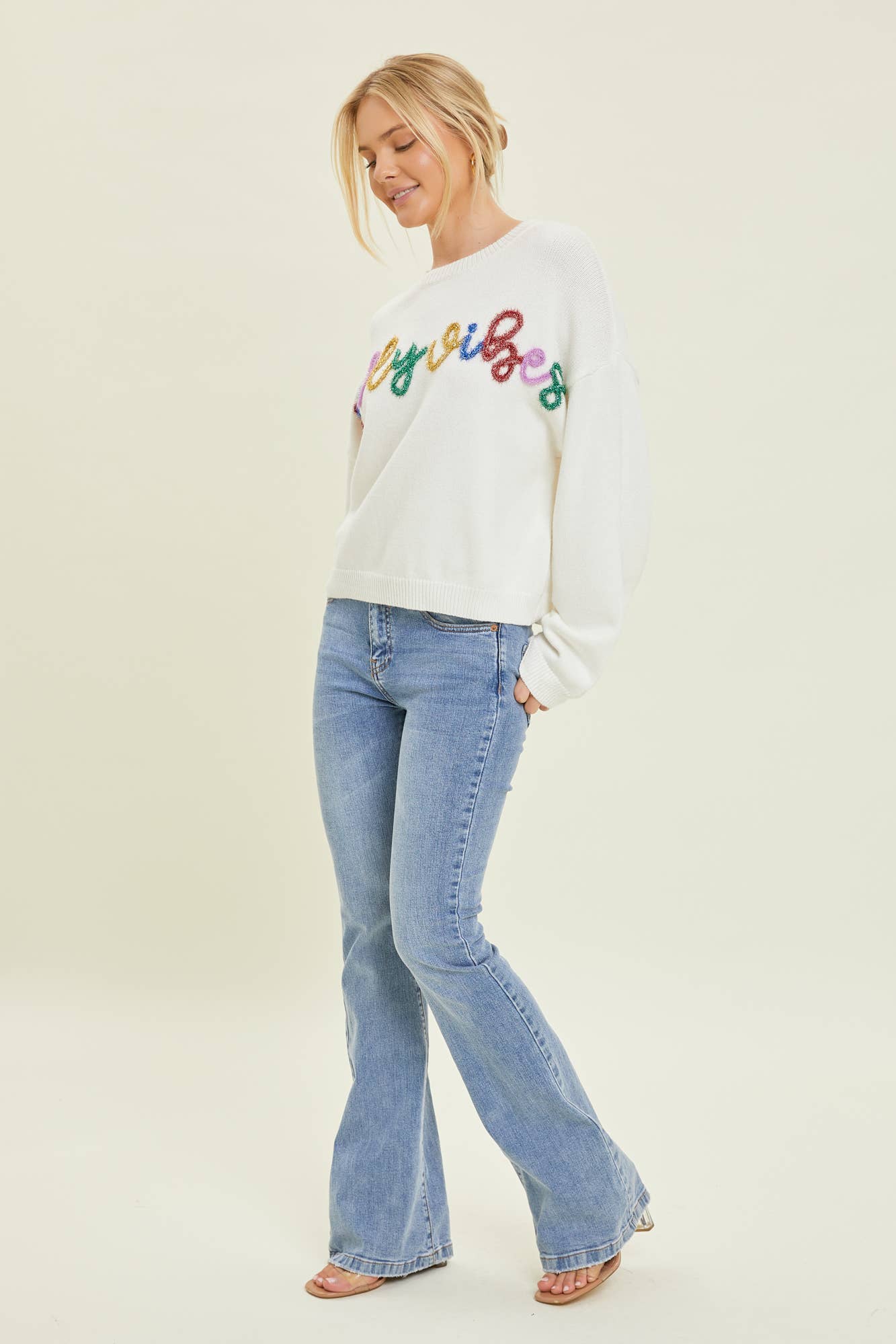 Spread holiday cheer in our Jolly Vibes Sweater. With "Jolly Vibes" stitched across the front, this fuzzy sweater exudes warmth and fun. Perfect for the holiday season, it's sure to bring out your festive spirit.