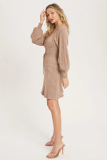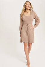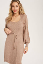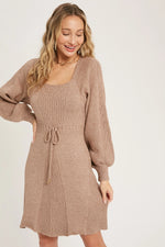 Cozy sweater dress featuring an all over cable knit design, square neckline, long balloon sleeves, drawstring waistline, fit and flare silhouette. -Model is 5'8" and wearing a Small