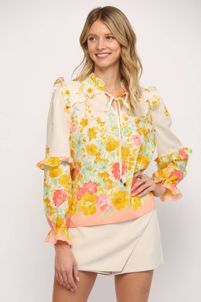 OMBRE FLORAL PRINT SPLIT NECK RUFFLE DETAIL BLOUSE