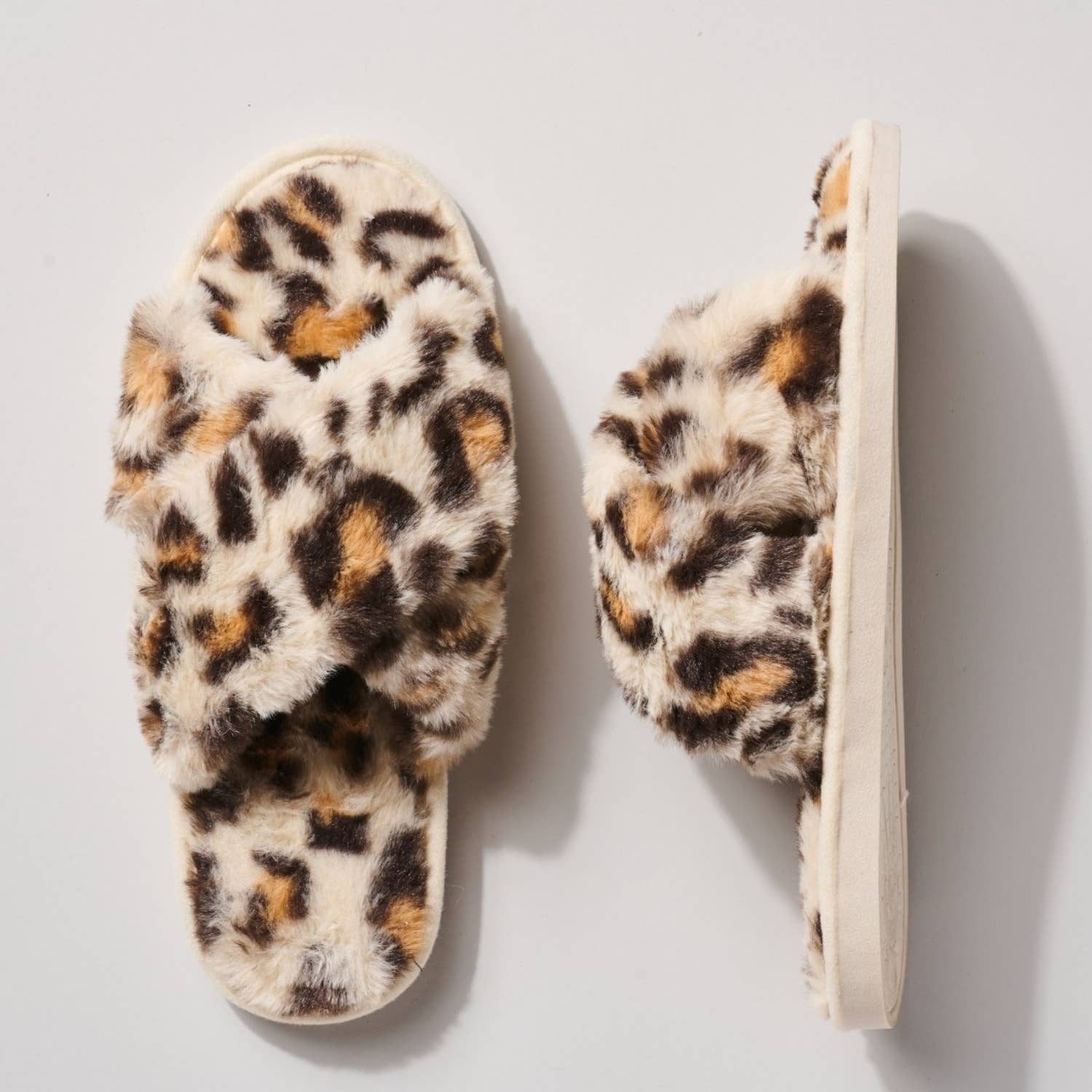 Leopard print faux fur cross body slippers with hard sole. Available sizes: S(6/7), M(8/9), L(10/11) Please consider that sizes tend to run smaller than expected. Material: 50% PVC, 50% Polyester